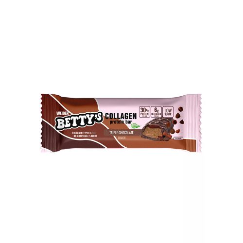 A Weider Betty's Collagen Protein Bar kollagén szelet triplacsoki ízű prémium fehérjeszelet 30% fehérjetartalommal és 6 g hidrolizált kollagénnel (I. és III. típus). Alacsony cukortartalmú, mesterséges aromáktól mentes formula, selymes csokoládé bevonattal. Ideális az izomtömeg fenntartásához és a bőr rugalmasságának támogatásához.